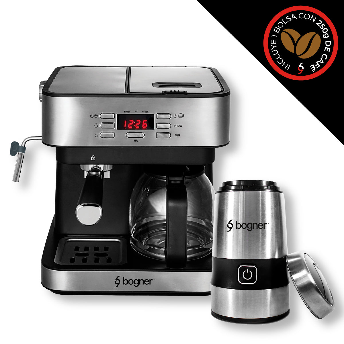 ¡Estrena cafetera y disfruta el aroma del café recién hecho! En la compra de cualquier cafetera, te regalamos una bolsa de café para que empieces el día con el mejor sabor. Promoción vigente al 31 de Julio 2025 o hasta agotar existencias. ¿Eres un apasionado del café? Este combo excepcional está diseñado para satisfacer tus necesidades cafeteras más exigentes. Descubre la calidad y versatilidad que solo Bogner puede ofrecerte. Características de la Cafetera 2 en 1: