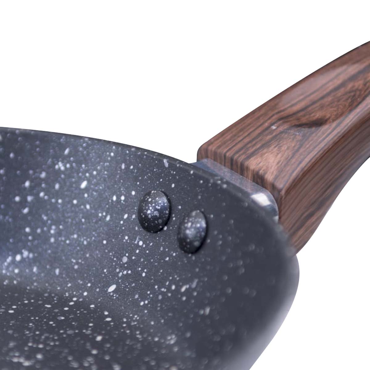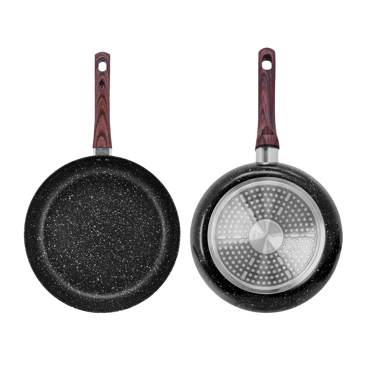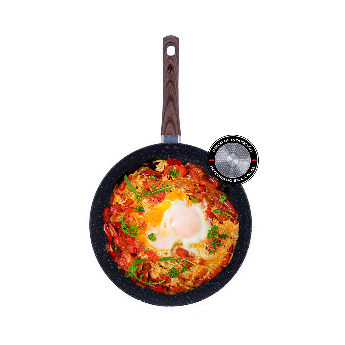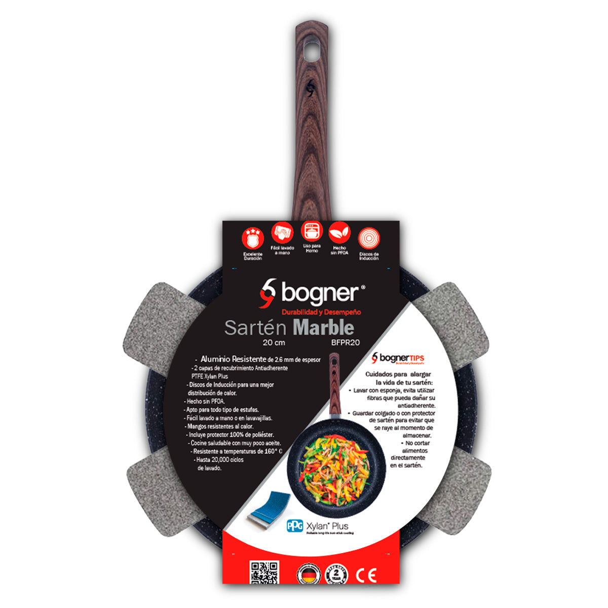 Sartén de granito con mangos y asas de baquelita recubiertos con poliuretano que permite puedas meterlo al horno sin preocupación de que se derrita o queme. Cuenta con doble capa de antiadherente moteado Xylan Plus libre de sustancias dañinas y resiste hasta 20mil ciclos de lavado. Resistente, ligero y con excelente distribución de calor. Los sartenes marble cuentan con un moderno diseño combinando materiales y acabados premium, baquelita recubierta de poliuretano en el mango, con acabados de granito en el cuerpo e insuperable antiadherencia. Este sartén cuenta con una placa de acero inoxidable en la base, la cual lo hace compatible con todo tipo de estufas. |